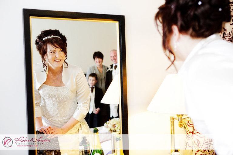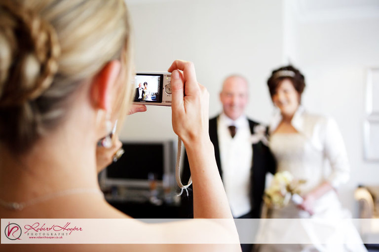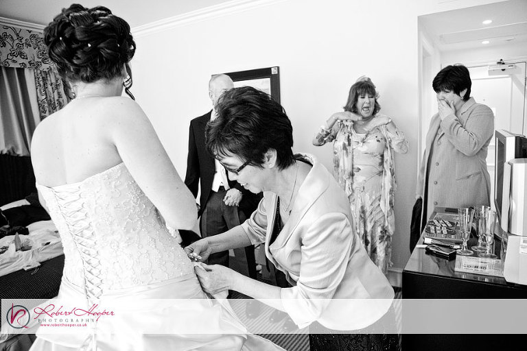This week I’d like to show you the wedding of Tara and Jon, who were married last Friday at the foot of Boxhill in the Burford Bridge Hotel. Kevin and I were on hand to photograph the celebrations, and were pleased to find a lovely spring day for the occasion. After meeting up at “Rykers Cafe” for a good breakfast before we began (Oh, that takes me back to the days… any bikers out there will know exactly where I mean) we ventured into the hotel to meet Jon and his groomsmen who were already in good spirits as they put the finishing touches to getting ready. After taking some nice shots of the boys, we then headed off to meet our bride Tara, who was already in her wedding dress and looked amazing! Don’t take my word for it though… have a look at some pictures: here’s Mum – trying hard not to cry for the umpteenth time already today!
